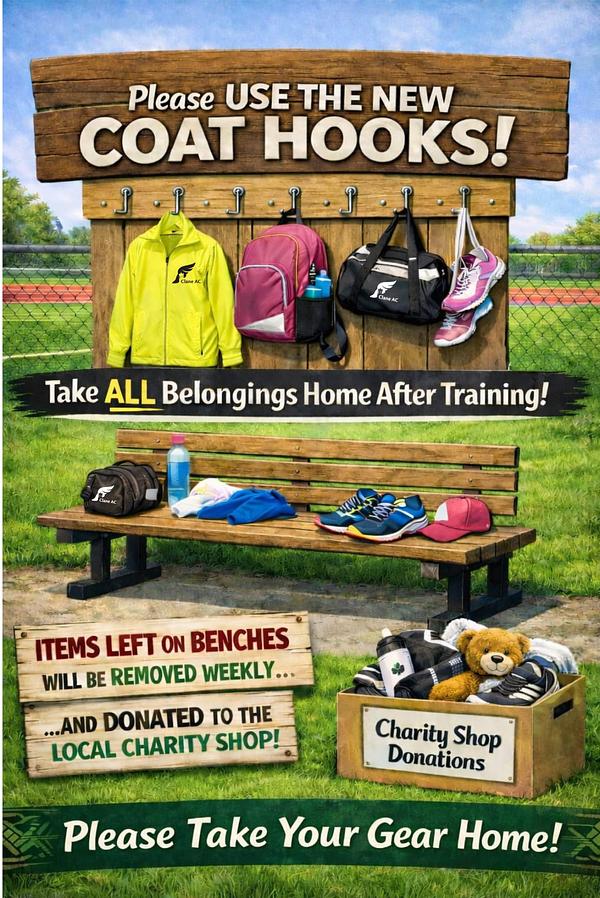 Clane Athletic Club are encouraging all our members to use the new coat hooks provided, and to ensure all items are taken home after each training session.